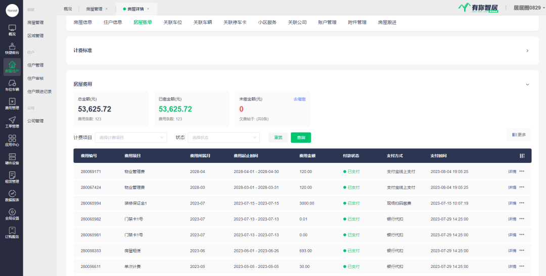 房屋账单显而易见,就是物业收取各种费用的项目表,关于计费项目的标准、单价、周期等,都事无巨细。物业人员在查看时,能够快速了解该房屋的收缴情况,再加以催缴。