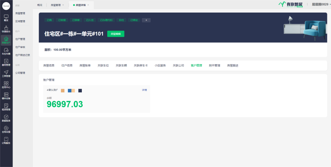 账户管理是指业主预存的账户余额管理。里面记录着业主绑定的房屋/车位,还有交易记录。
