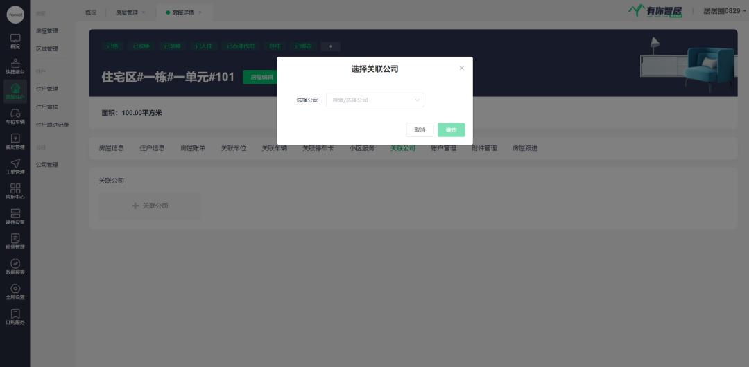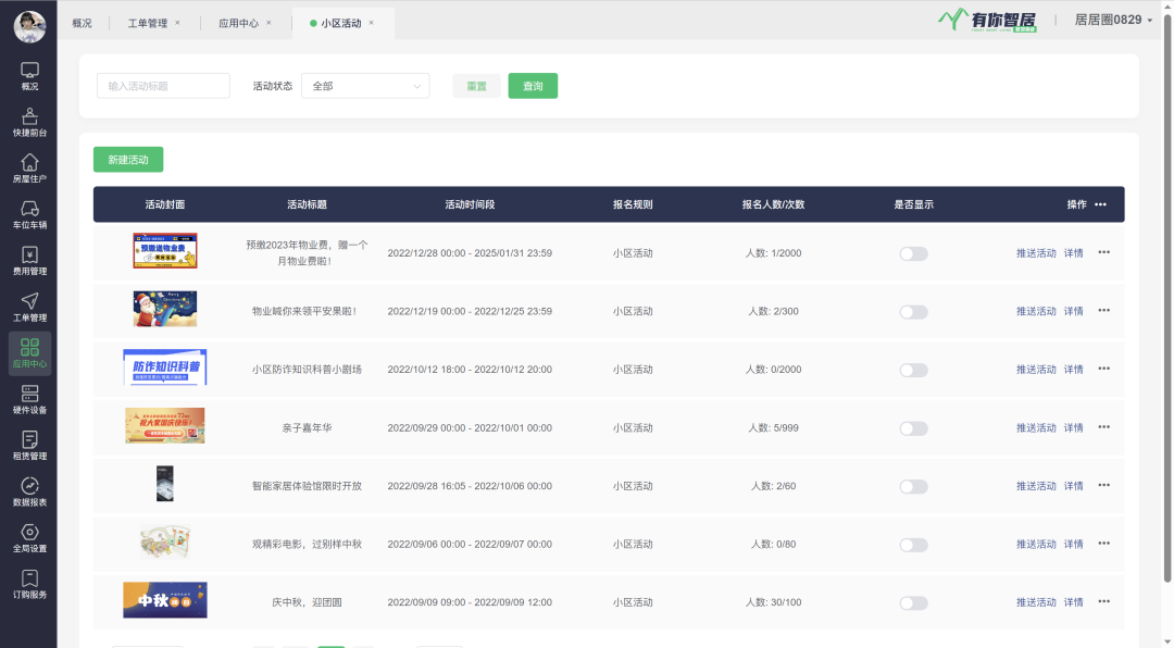首先登录有你智居物业管理系统后,映入眼帘的就是小区的整体概况,可以看出里面的端口多,功能种类多。