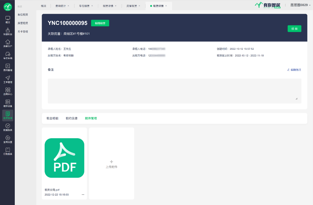 附件管理里存储着租户合同附件、商家与物业签订的合同等公开电子版文件。