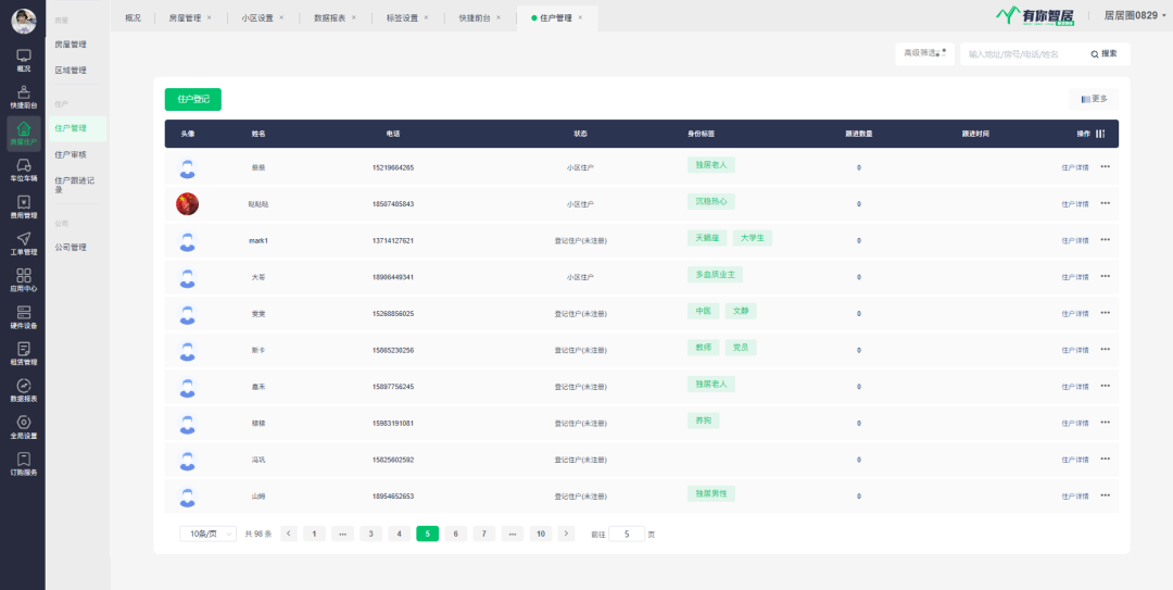 例如:物业想慰问小区所有的“独居老人”,点击“独居老人”标签后搜索,结果将会显示所有独居老人的房屋。让物业更快地找到需要特别照顾/关注的住户群体。