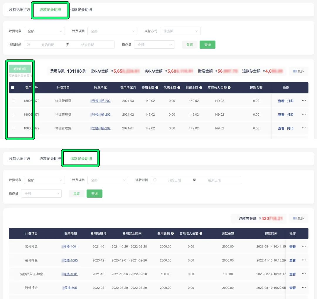 如果其他业主也想要票据,可以在【费用管理】中的「收退款记录」进行精准筛选后打印。