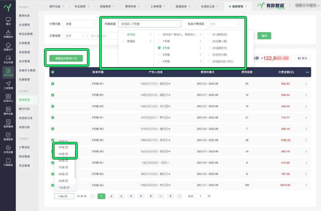 前台客服小张,进入物业系统【费用管理】版块中的「催缴管理」只需筛选单元信息,系统即刻筛选出2栋2单元相关欠费的房屋名单。