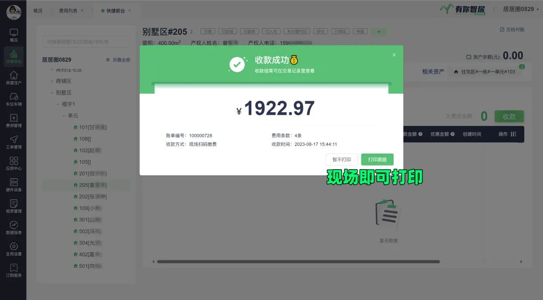 系统页面会提示物业人是否需要票据打印,点击打印后,整个流程就完成了。