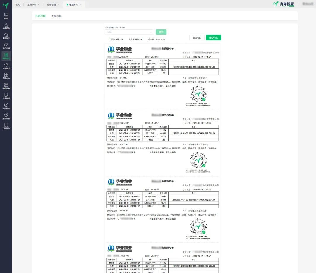对于物业费用票据的打印以及催费数据查找,有你智居不仅提供了高效的收费和查询功能,更允许物业在票据上添加企业的LOGO、小程序二维码(收款码、查询码)和公章,这增强了物业的品牌形象,加强票据的正式性,使其更具权威,业主和住户会更加信赖其内容的真实性。