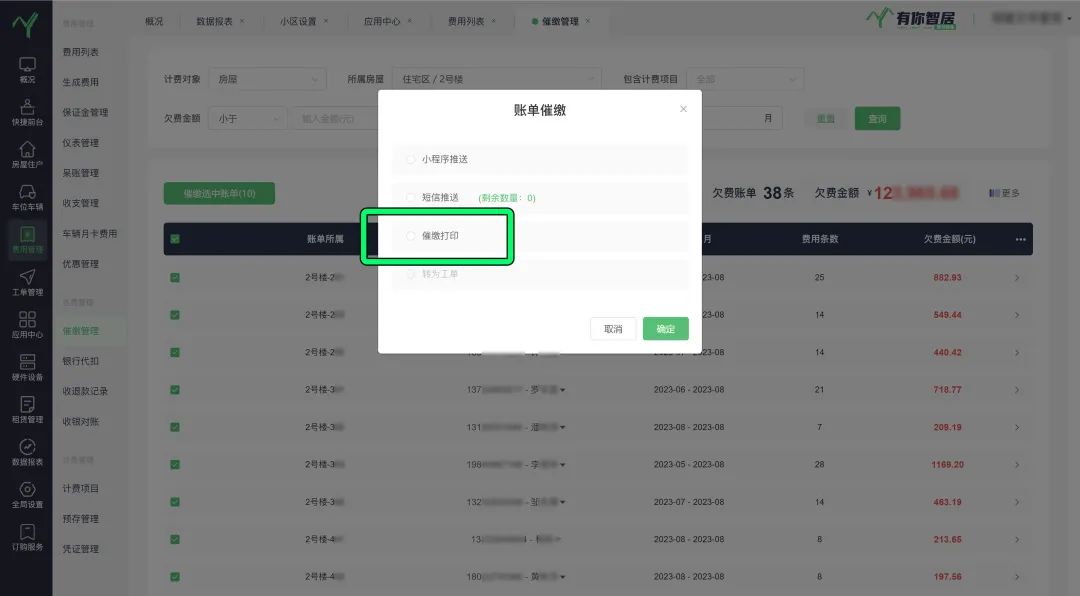 而,运用有你智居智慧物业系统,在不到10秒的时间内就能快速筛选出欠费的房屋,并启动打印任务。