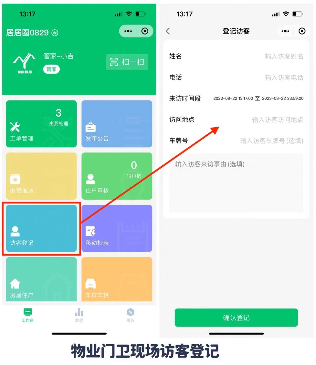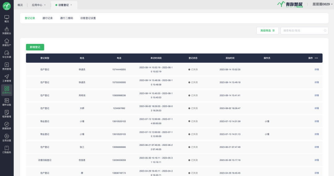 为了解决这些难题,「有你智居」智慧物业管理系统通过「访客登记」版块,物业能够掌握所有访客信息,一旦小区出现什么安全问题,都能快速排查访客。
