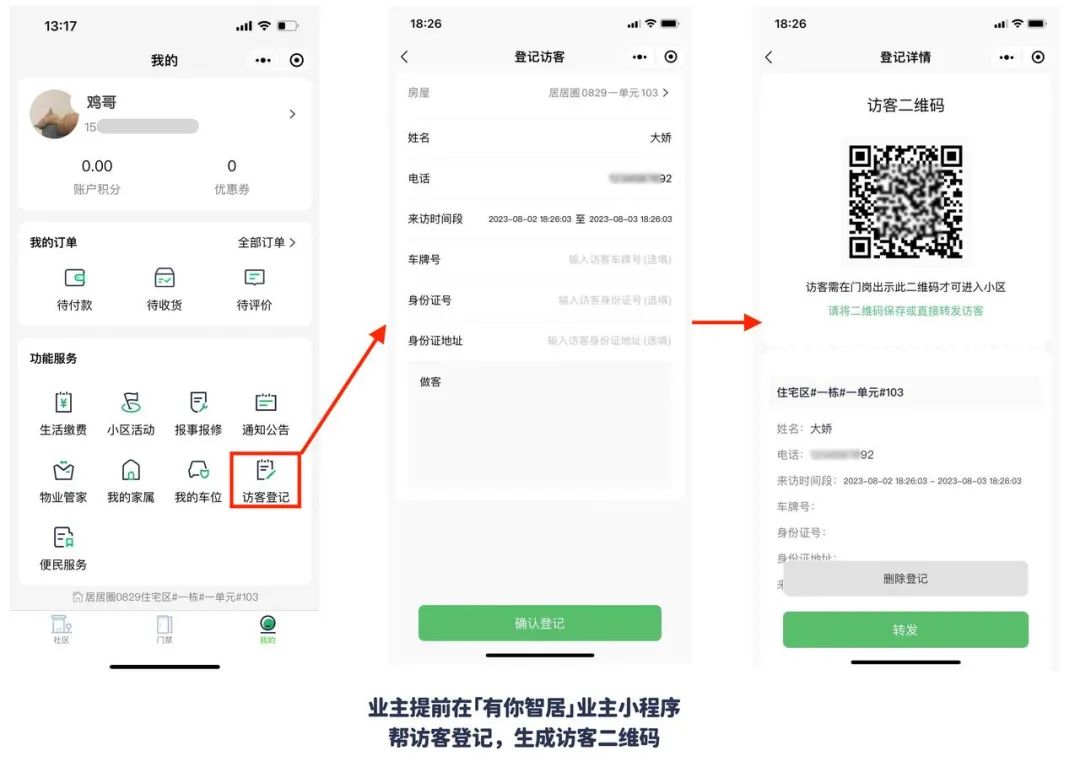 小区住户提前在【有你智居】小程序帮他的访客登记好来访信息,生成访客二维码。