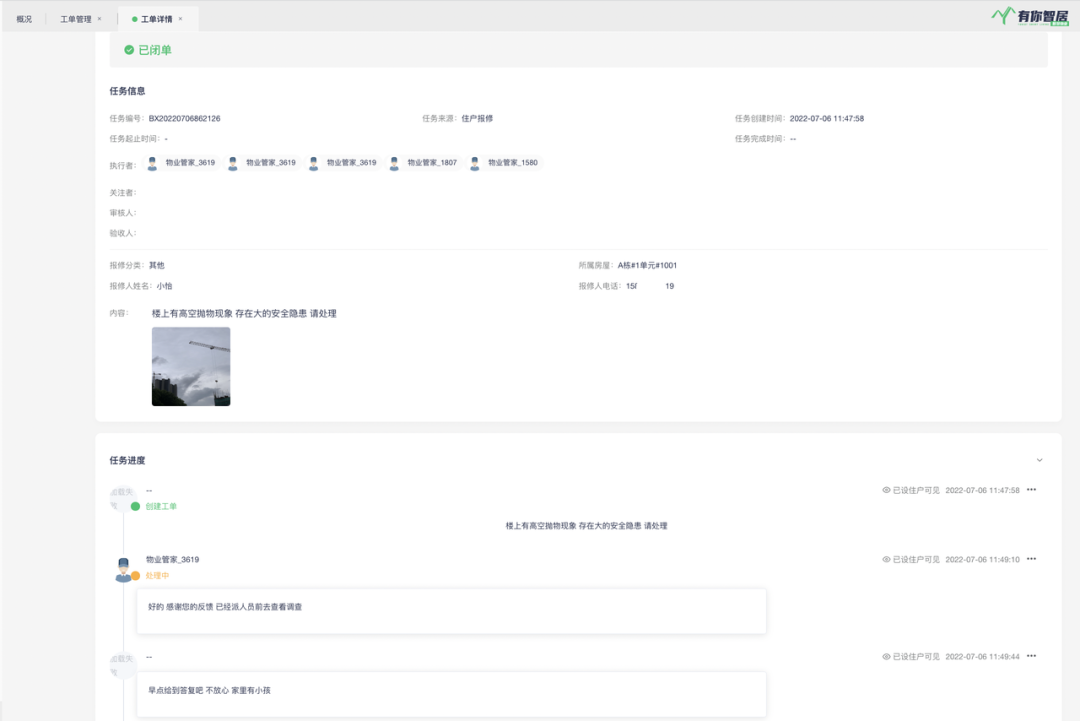 有你智居物业软件「工单管理」联动各部门及时响应
