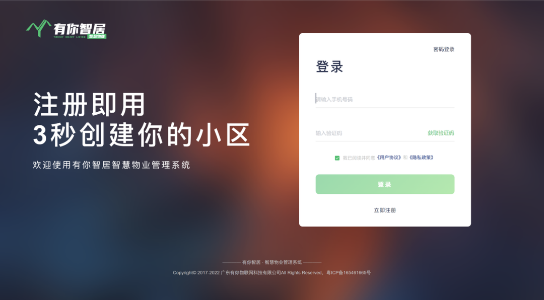 有你智居智慧物业软件在线上完成注册后就可以直接使用系统功能。无需安装软件或者购买服务器等硬件设备。同时也省去了维护和升级系统所需要投入的时间和资金。