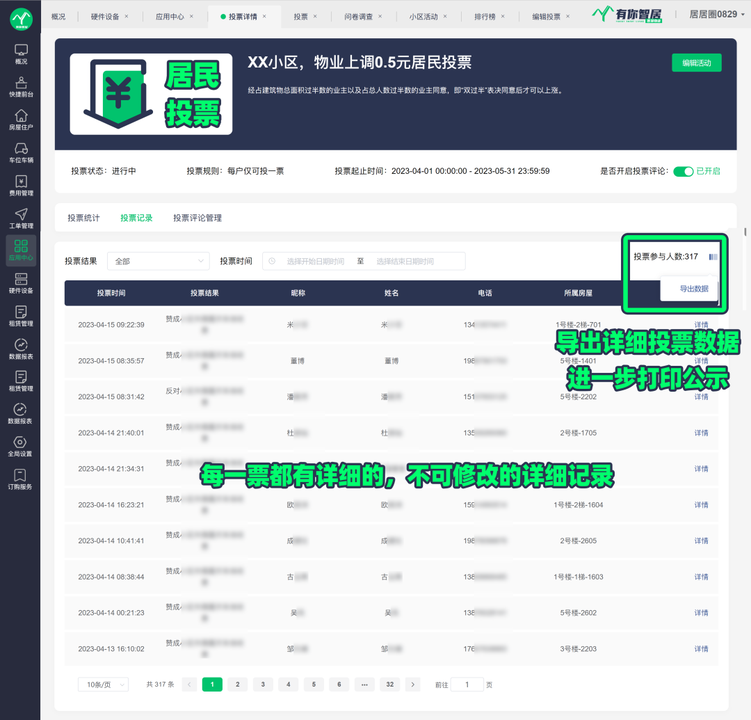 物业可以通过有你智居智慧物业管理系统,开展实名投票活动,让每一位业主都能参与社区决策。