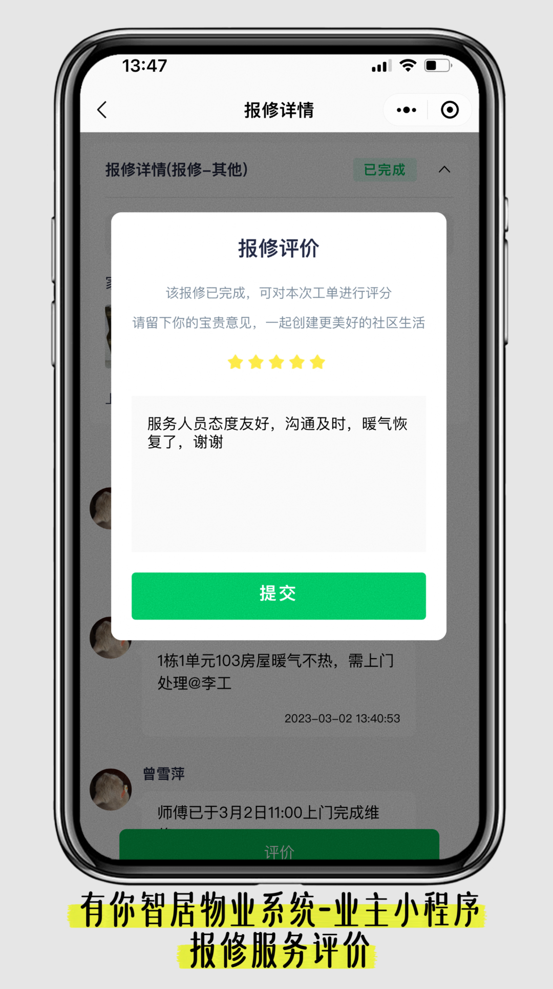 业主需要一个方便快捷的通道来表达他们的需求和问题。有你智居物业软件提供了一个完美的解决方案,该平台允许业主通过微信小程序提交投诉和报修请求,同时还能随时查看请求的状态。这不仅使流程更为透明,还能增加业主的参与度。