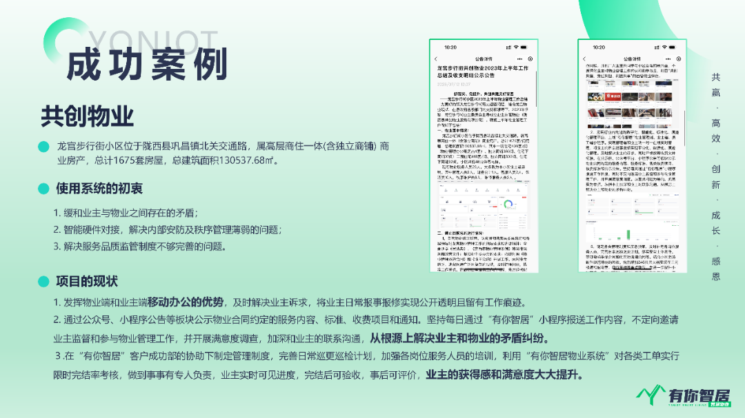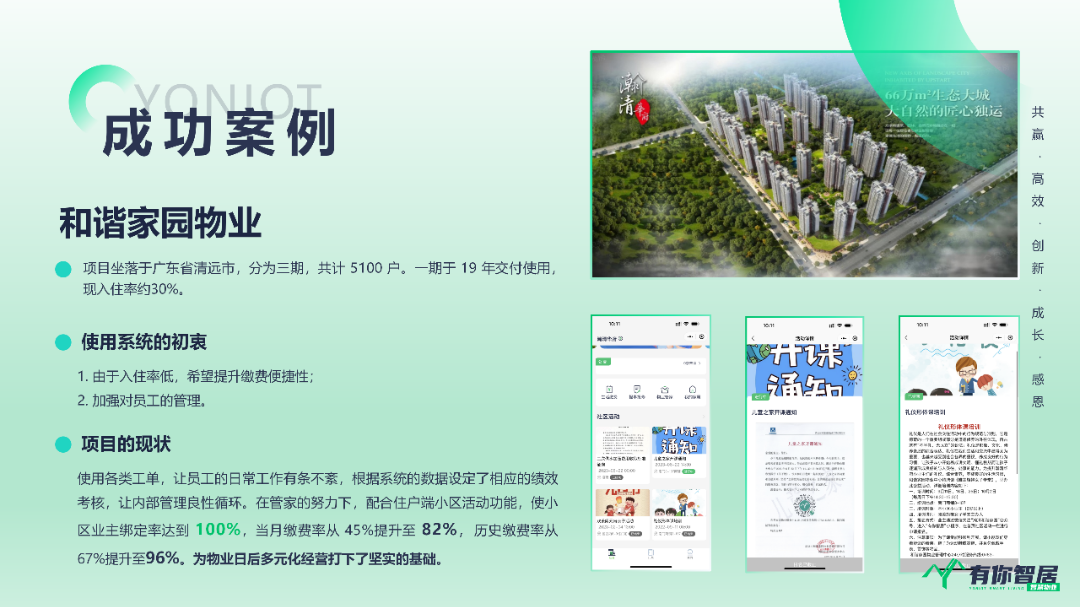分享了公司产品「有你智居智慧物业SaaS系统」是如何利用科技与先进管理,一一击破物业管理痛点,成功落地数字化,为物业企业提供更高效、便捷和智能化的物业管理和服务,为住户打造全新的生活体验。