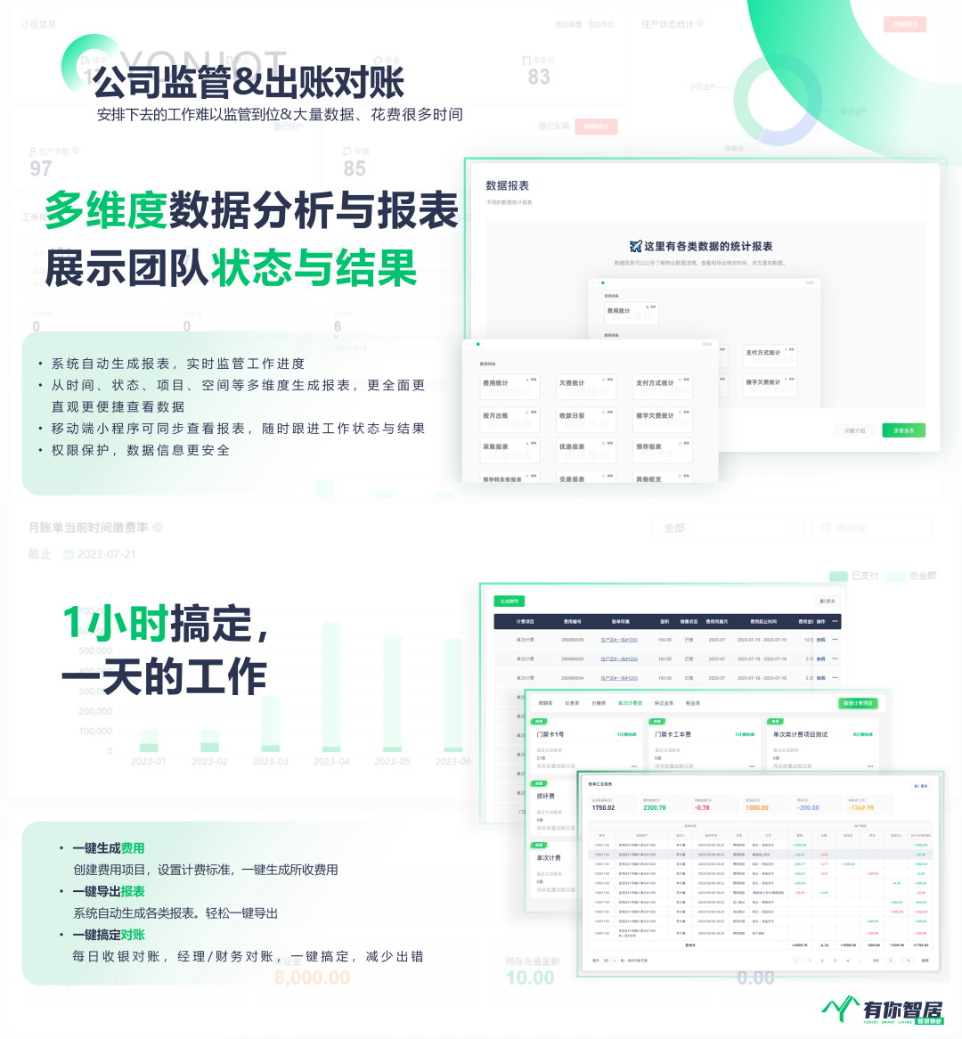 对物业企业内部而言,有你智居智慧物业管理系统数字智能化的数据分析报表、便捷的操作界面、高效的资源调度...每一个功能都能为物业公司带来了实实在在的好处。
