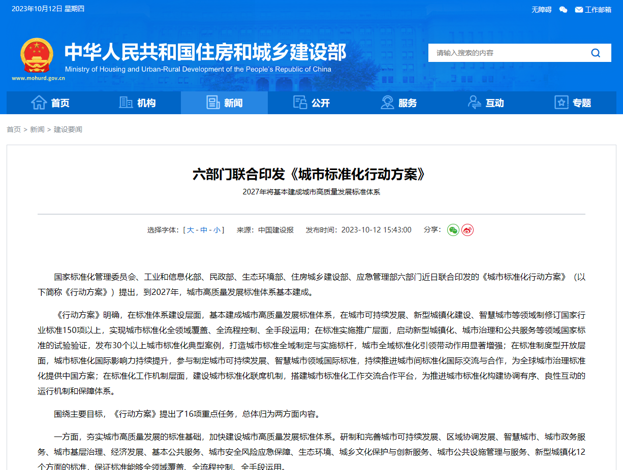 国家标准化管理委员会、工业和信息化部、民政部、生态环境部、住房城乡建设部、应急管理部六部门近日联合印发的《城市标准化行动方案》(以下简称《行动方案》)提出。
