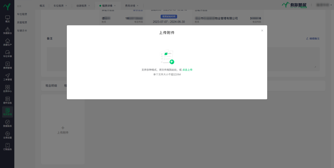 当然,为了保证租赁行为的合规性/完整性,有你智居智慧物业系统也提供了租赁合同的上传功能,物业管理者可以将合同扫描或者拍摄后上传到系统,这让合同的存储和查阅变得更为方便。