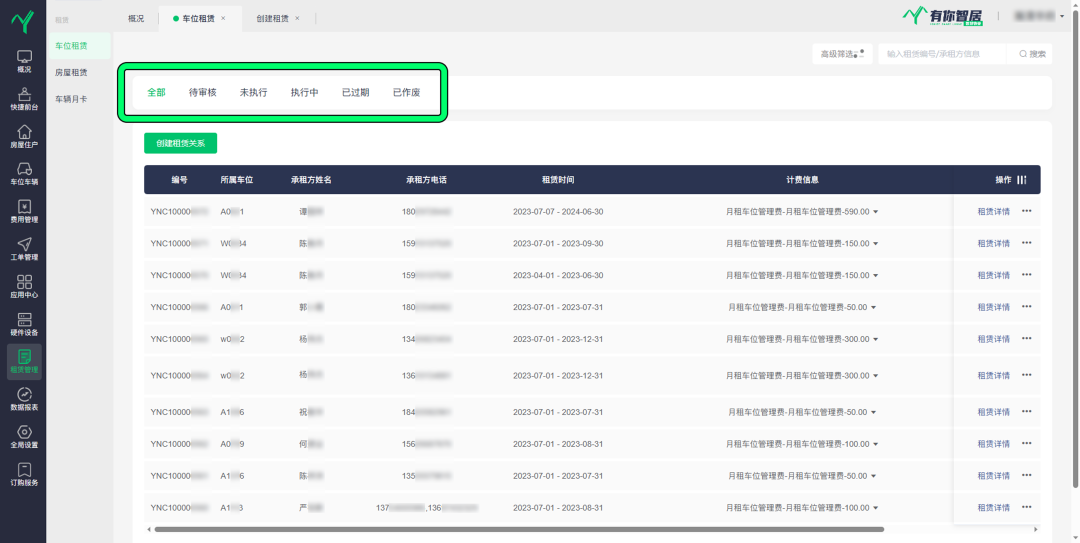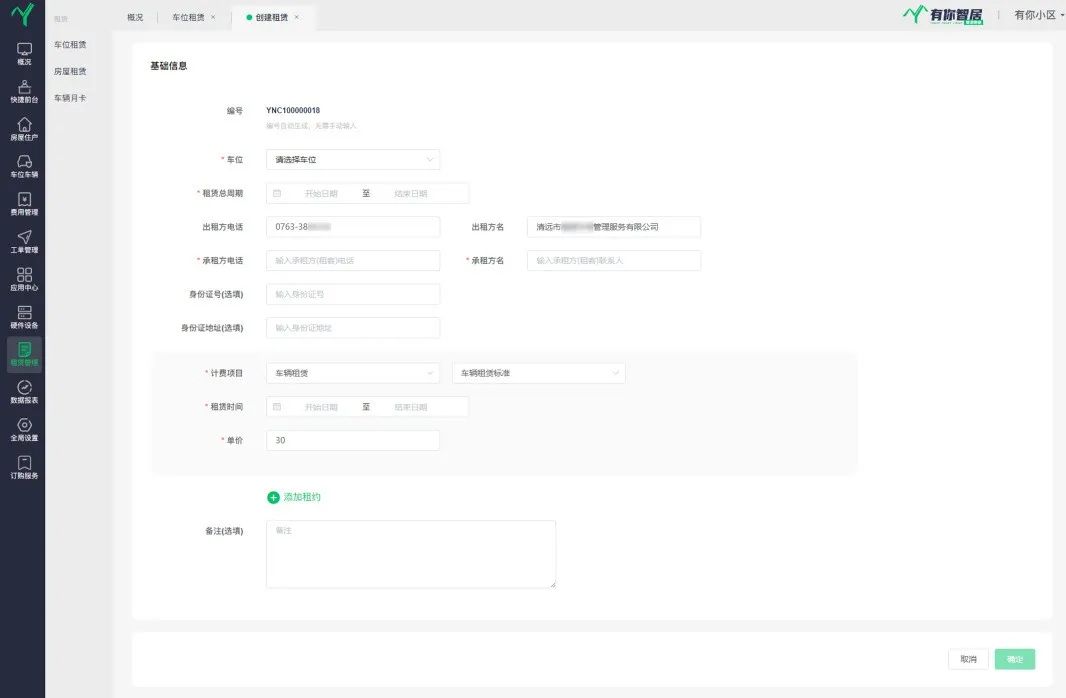 有你智居智慧物业系统的车位租赁管理功能,可以帮助物业管理小区全局的车位租赁信息。以所属车位为单位,系统会自动生成独立编号,承租方的姓名、电话,租赁跨度时长、计费信息。