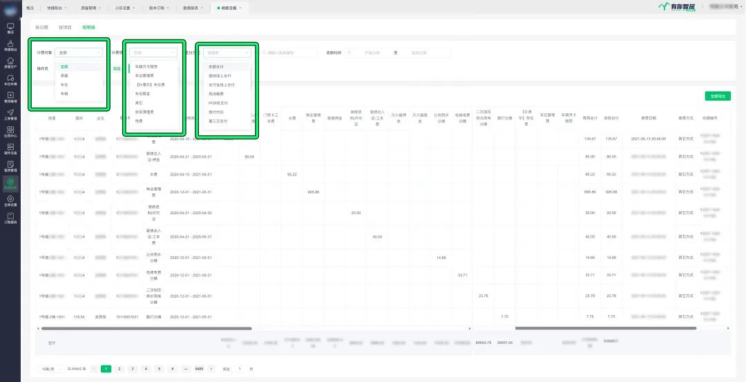 我们更提供了一种按明细查看的方式。你可以按计费对象(例如房屋、车位、车辆)→计费项目→支付方式,甚至是操作员来筛选数据,生成多维的数据表格。为物业管理提供了更深入和精细的视角。