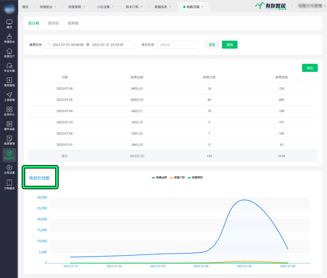 不用担心,“有你智居智慧物业系统”-「收款日报」版块,能帮助物业轻松管理物业费用,让你随时随地掌握物业费用收款情况。