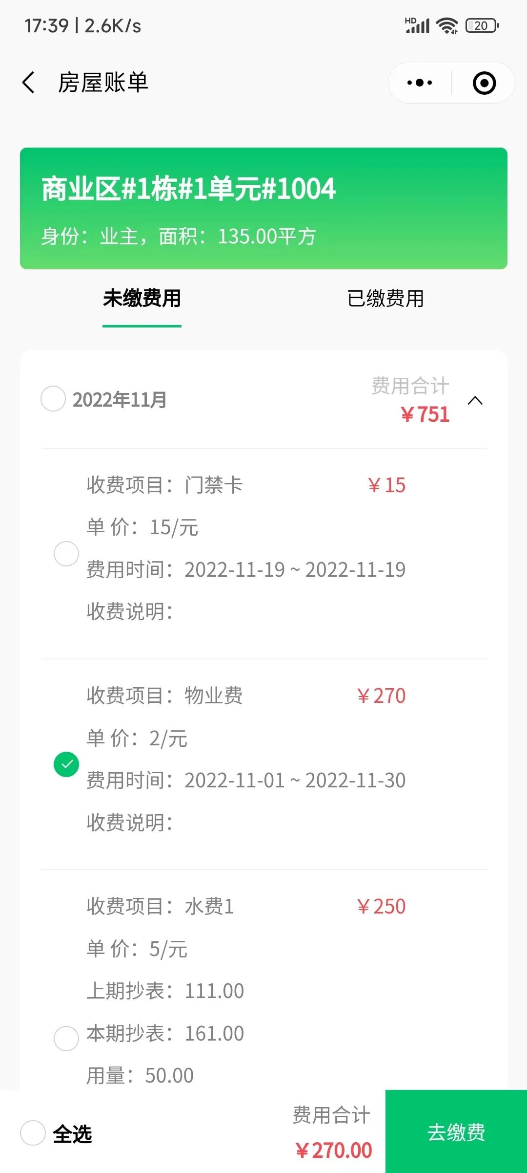有你智居业主小程序-房屋账单