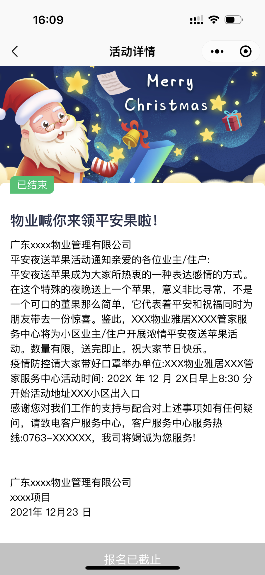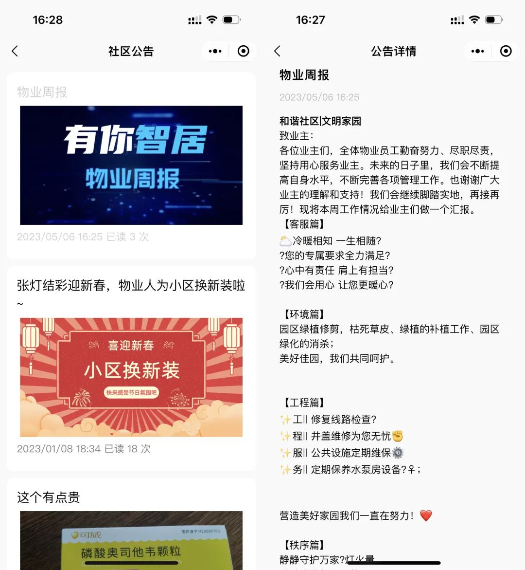 物业通知公告,发放物业周报,社区电子公告板,社区微信群等输出物业工作动态。