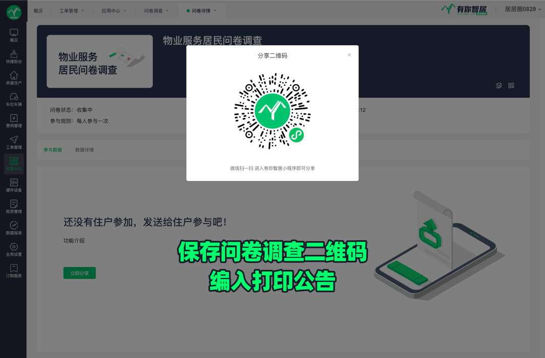 还可以在智慧物业系统3.0pc端生成该问卷调查的二维码,物业工作人员可以将其编辑进即将打印张贴的公告或海报上。