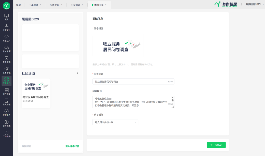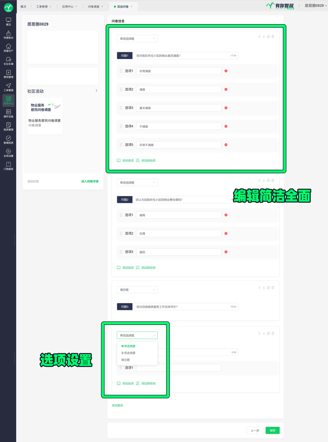 通过有你智居智慧物业系统的「问卷调查」版块,能帮助物业人更快解决这些问题。帮助物业快速定位问题所在。