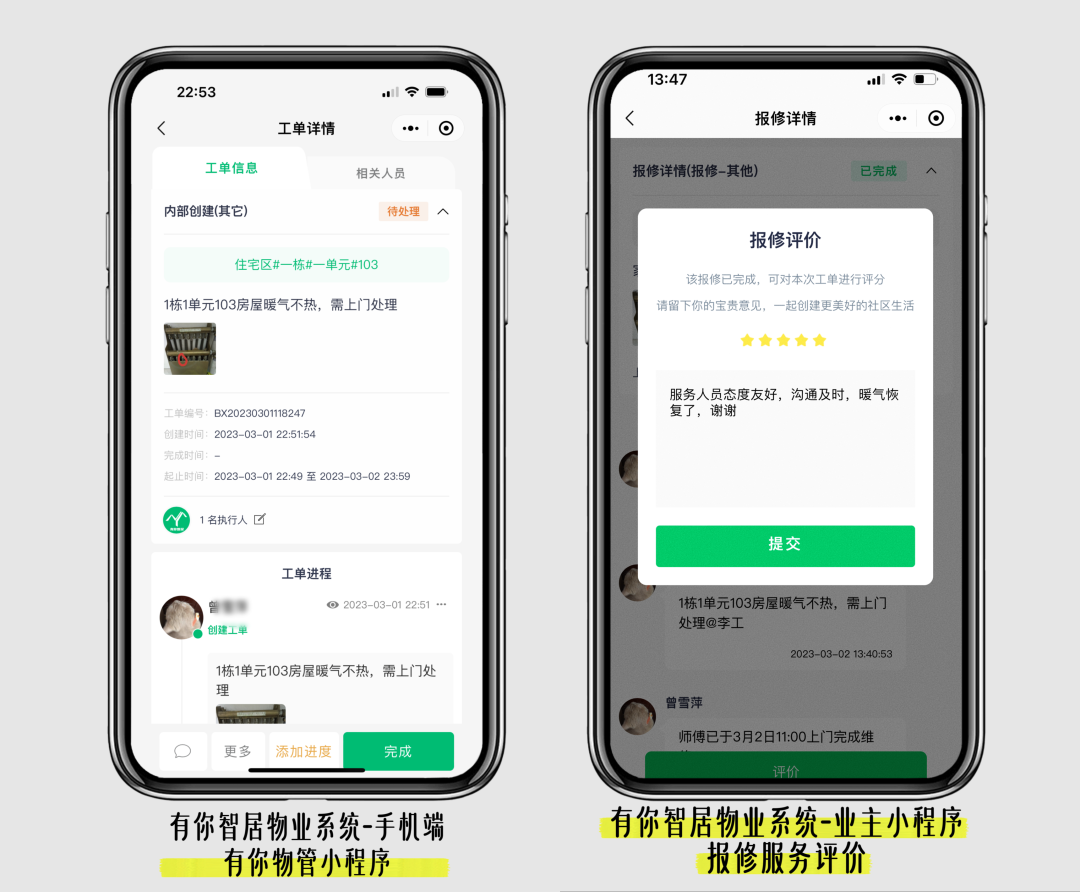 传统物业维修处理好,物业就单方完成维修,对于业主来说整个维修进度和结果无从知悉,如果下次看到没维修好又要再次报修,耗时耗力