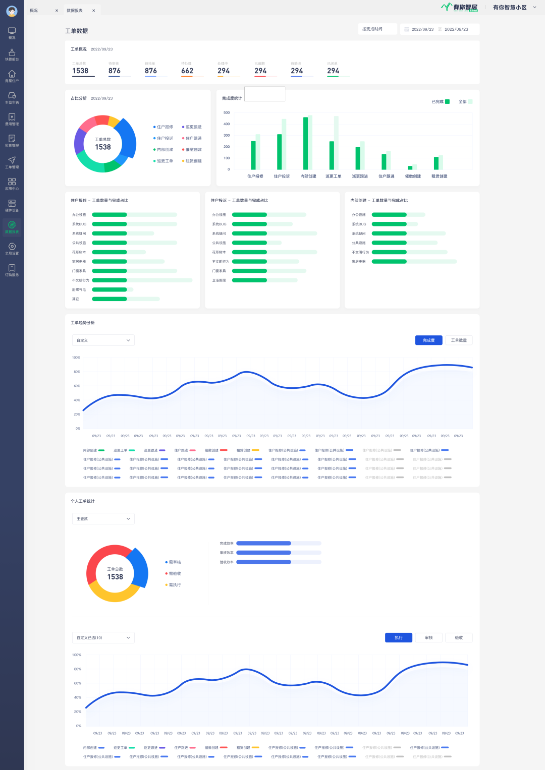 所有工单报修完成情况都有记录,物业企业可以对工单情况进行分析与统计,做出相应的管理和服务优化。