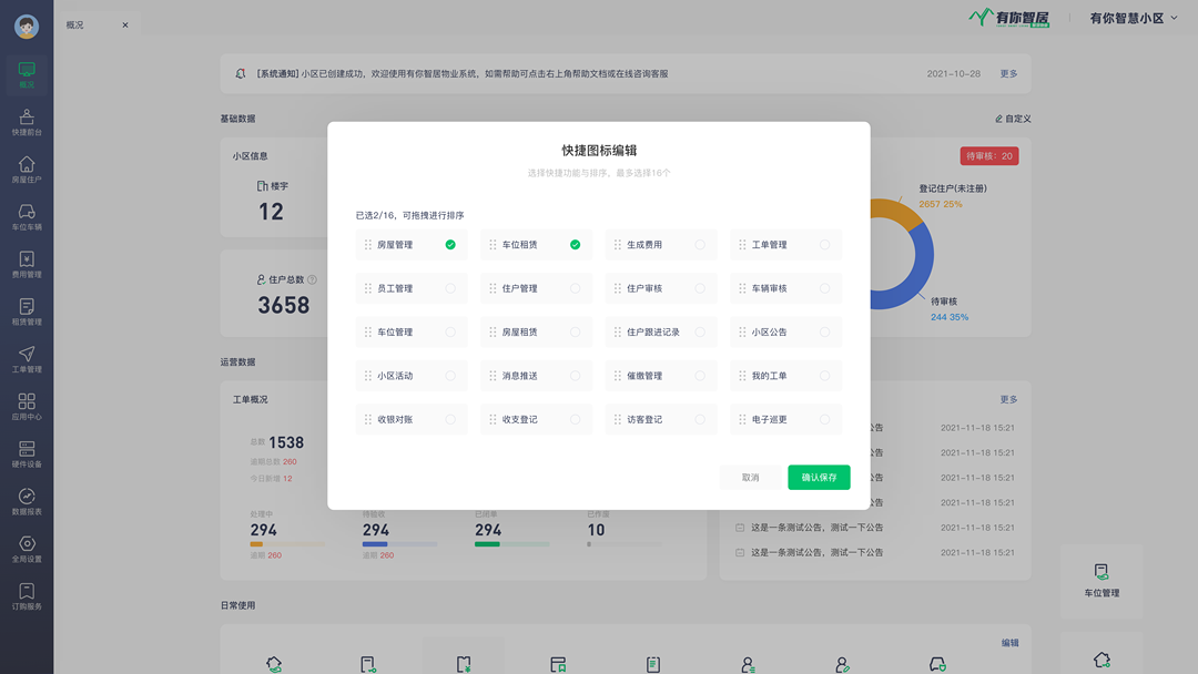 为了满足不同物业人员的使用需求和操作习惯,有你智居智慧物业系统3.0PC端「概况」页面增加了自定义功能。