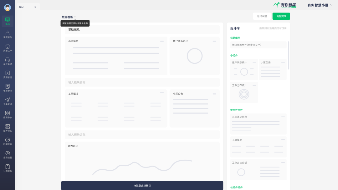 1️⃣根据不同的物业工作职责和业务需求,系统用户可以调整概况控制台的模块布局和显示方式,使其更符合用户的使用场景和操作习惯。