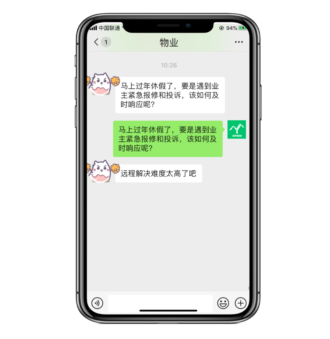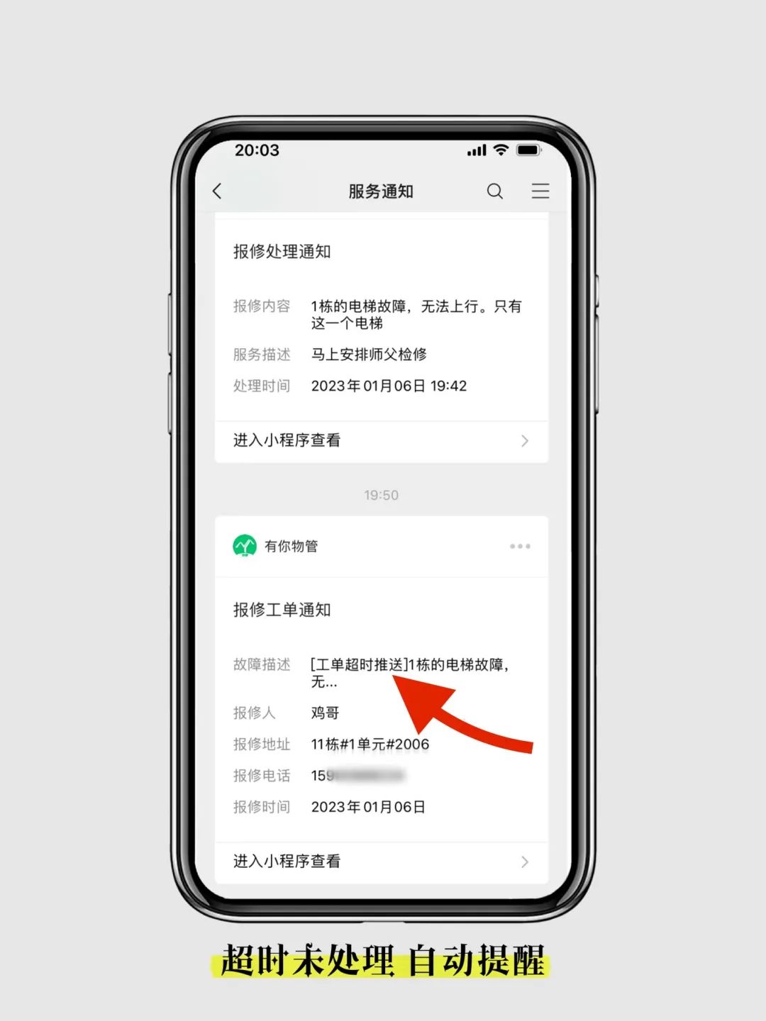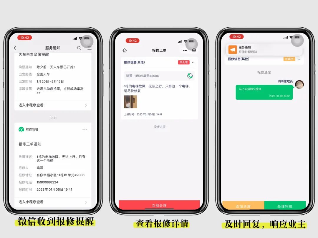 当业主报修,物业人员的手机微信会自动收到报修提醒。这样,他们可以判断报修投诉的紧急性,对于紧急的情况,可以及时派人处理;对于不紧急的,可以先通过小程序回复业主,约定在节后安排处理。