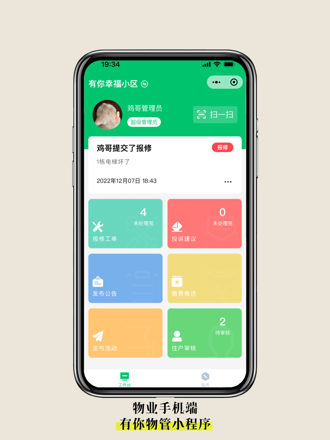 我们今天就以"春节假期,业主报修如何线上协同处理"为例,来探讨一下这个问题。春节假期期间,物业人员并不可能每时每刻登录系统后台,时刻关注业主的报修和投诉。但是,利用"有你智居物业系统"的手机应用程序,即"有你物管"小程序,物业人员可以实现远程查看和处理业主报修事项。